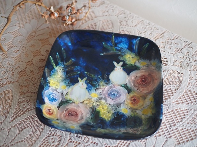 野村晃子 花四角多用皿【薔薇とミモザとうさぎ】