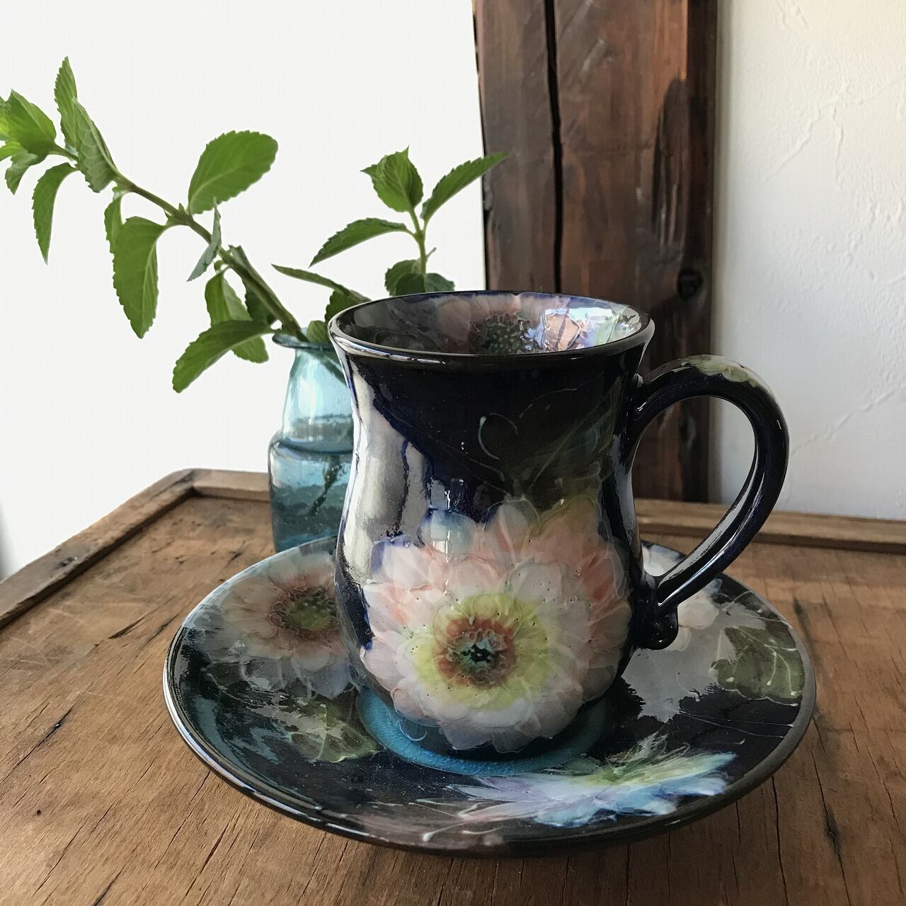 野村晃子 花柄チャイマグ&ソーサー【黒ダリア】