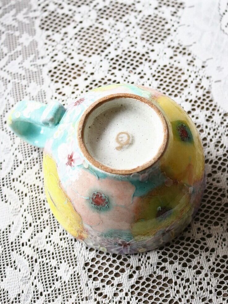 カラフルな花々がゴージャスに描かれたカップです。