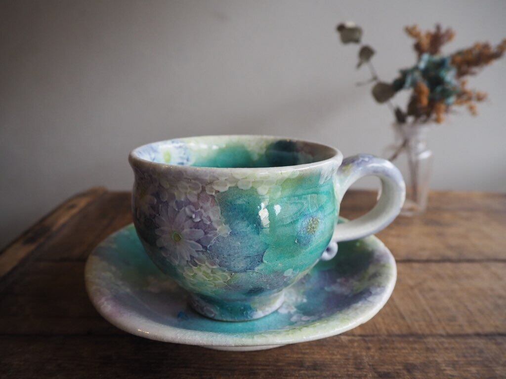 カラフルな花々が鮮やかに描かれたカップ&ソーサーです。