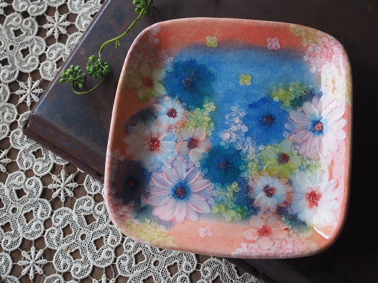 野村晃子 四角多用皿【ブルーフラワーガーデン 】