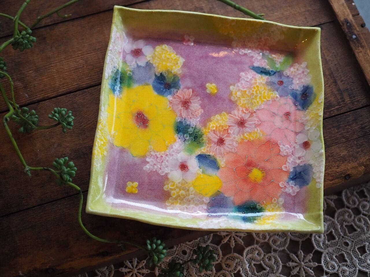 野村晃子 花柄四角皿(大)【 色彩バラ(黄) 】
